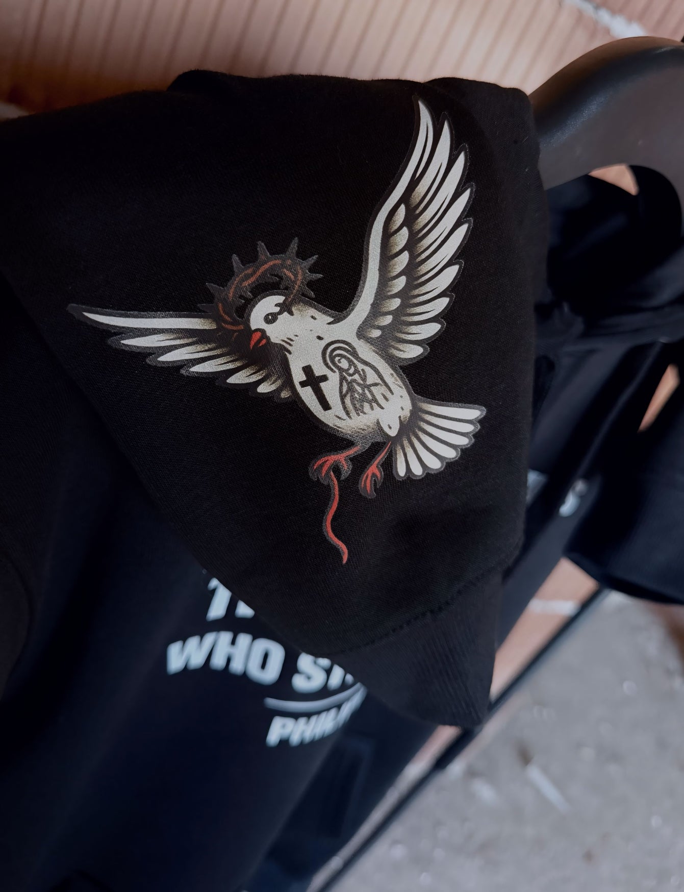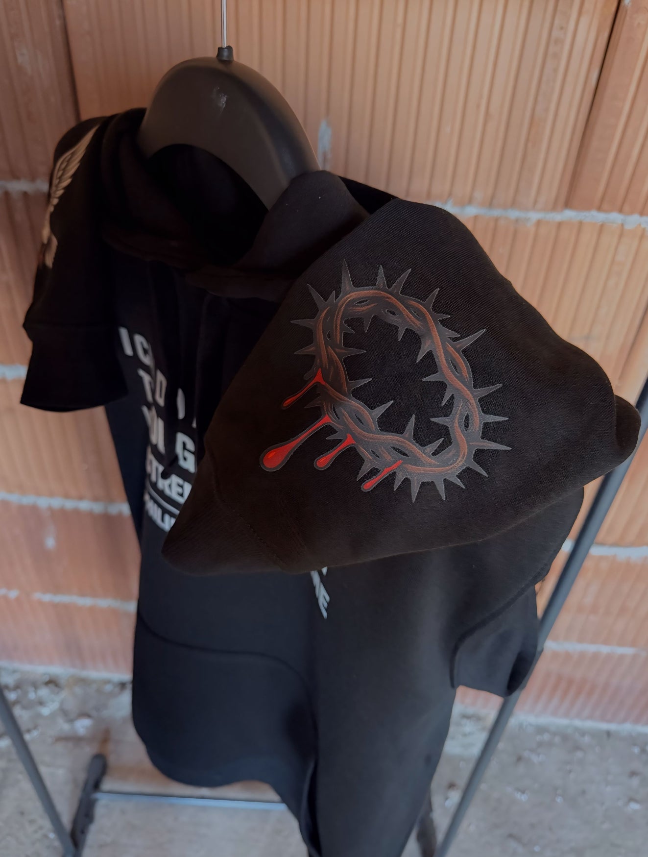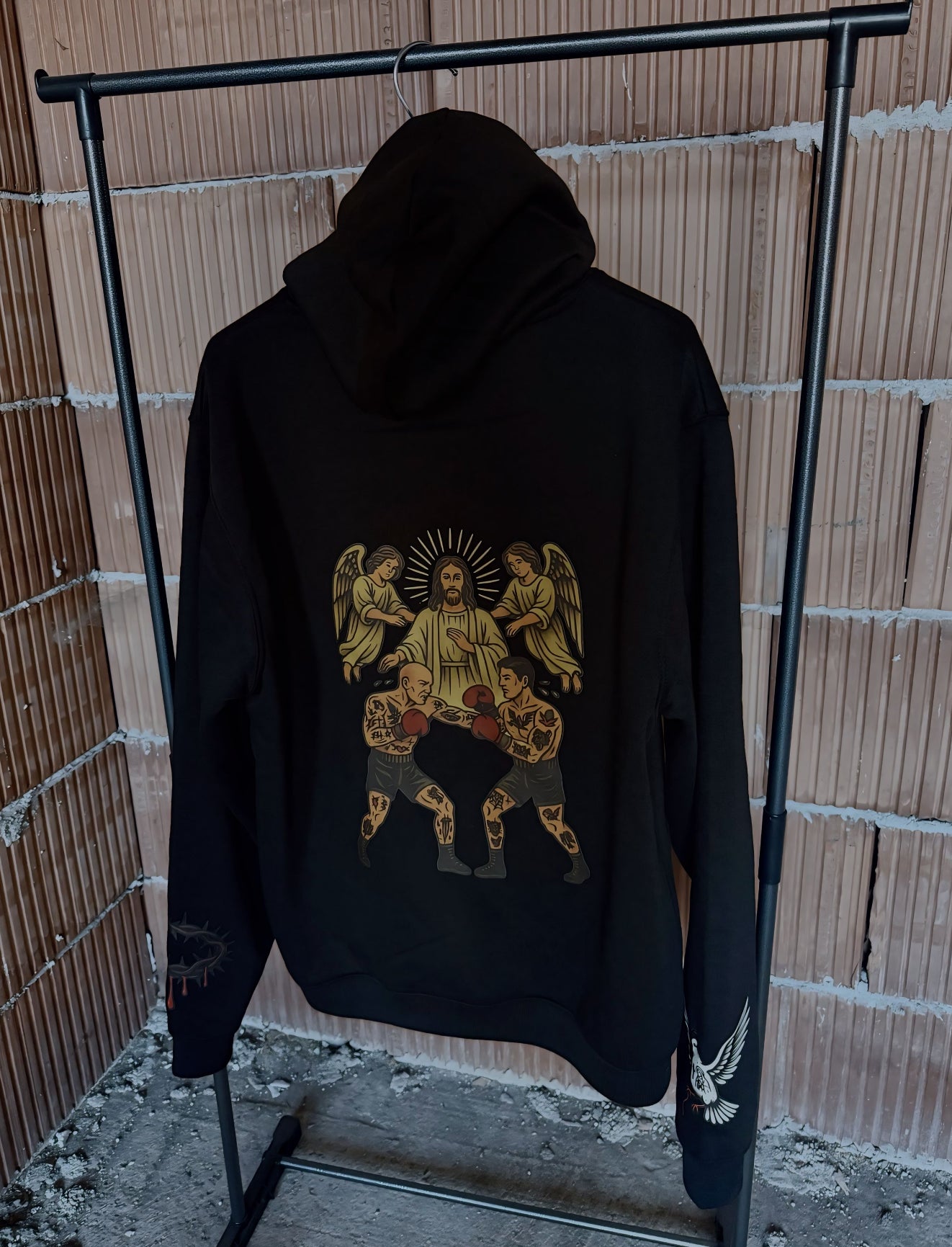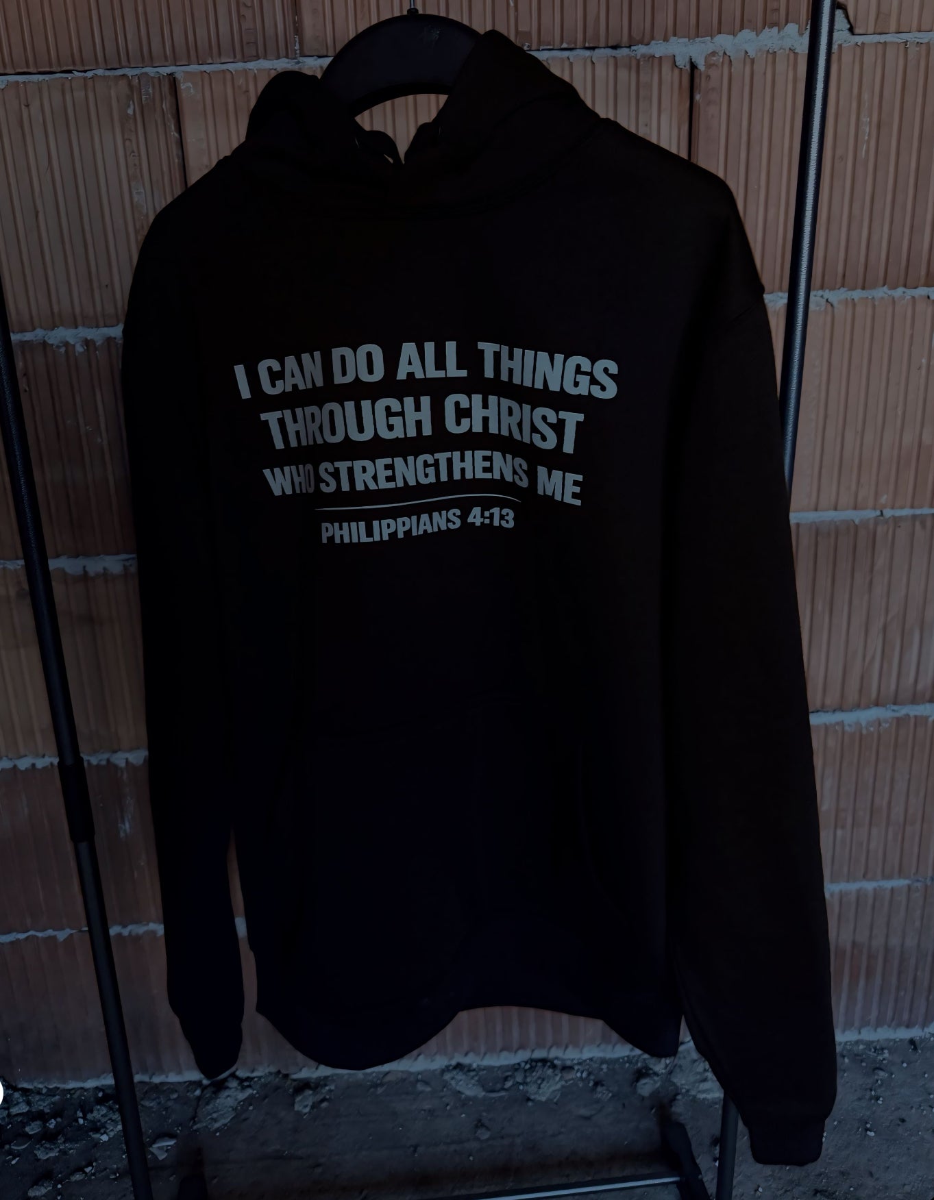 Гърбът е акцентиран с впечатляващ художествен принт, съчетаващ символика за сила, вяра и борбен дух. Отпред е изписано вдъхновяващото послание “I can do all things through Christ who strengthens me – Philippians 4:13”, което придава дълбочина и индивидуалност на визията. Детайлите по ръкавите допълват дизайна и създават завършен streetwear стил.